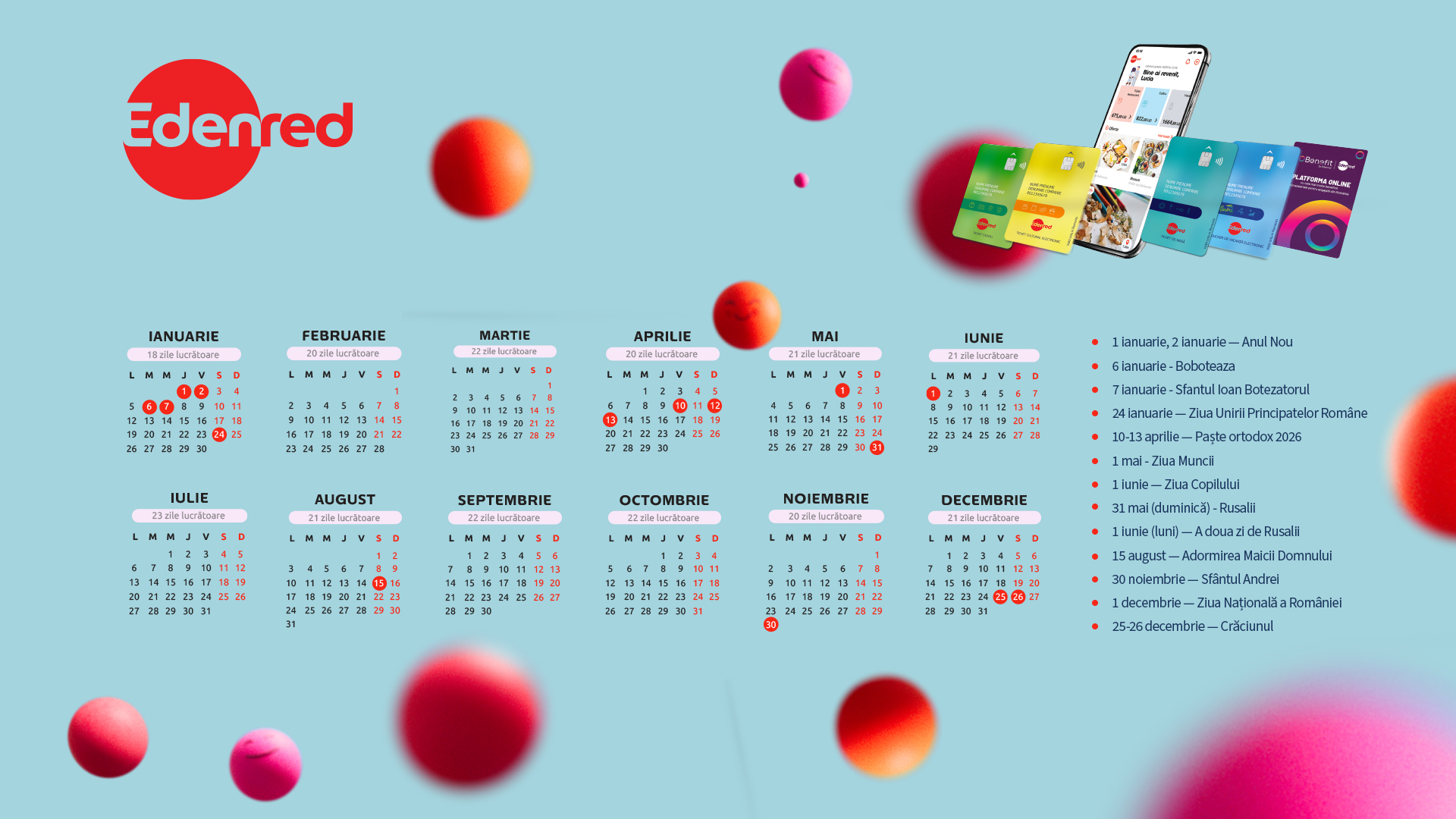Descarcă calendarul Calculează-ți economiileComanzi deja tichete de masă? Organizează-te mai uşor folosind calendarul zilelor lucrătoare şi al sărbătorilor legale din 2026 pe care l-am pregătit pentru tine!